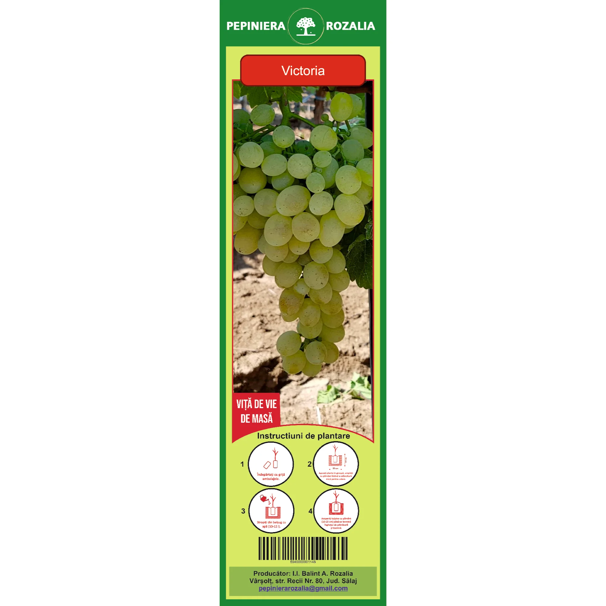 Soiul de struguri de masa Victoria se dezvolta foarte bine pe terenuri fertile, bine drenate, situate de regula la baza versantilor. Strugurii sunt mari si foarte mari, cu o greutate cuprinsa intre 400 si 600 grame, de forma conica sau cilindro-conica. Boabele sunt ovale, foarte mari (8-10 grame), cu pielita de culoare galben-verzui, cu pulpa carnoasa, crocanta, avand gust placut si echilibrat.